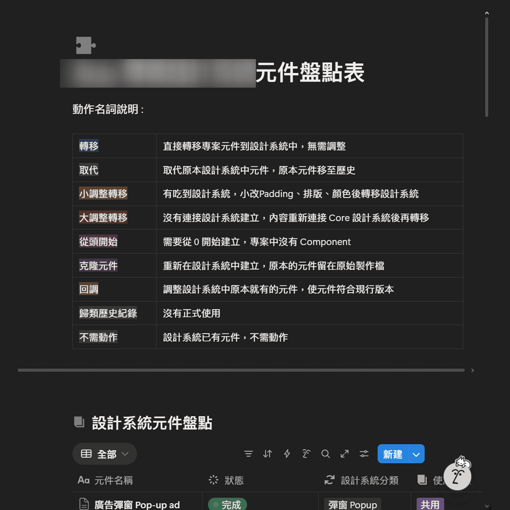 專案上線後,我開始整理整個專案的設計系統。首先建立一個 Notion 資料庫 來整理元件備註與分類,確認哪些元件要保留在專案檔案中,哪些需要拆分至專案設計系統。
