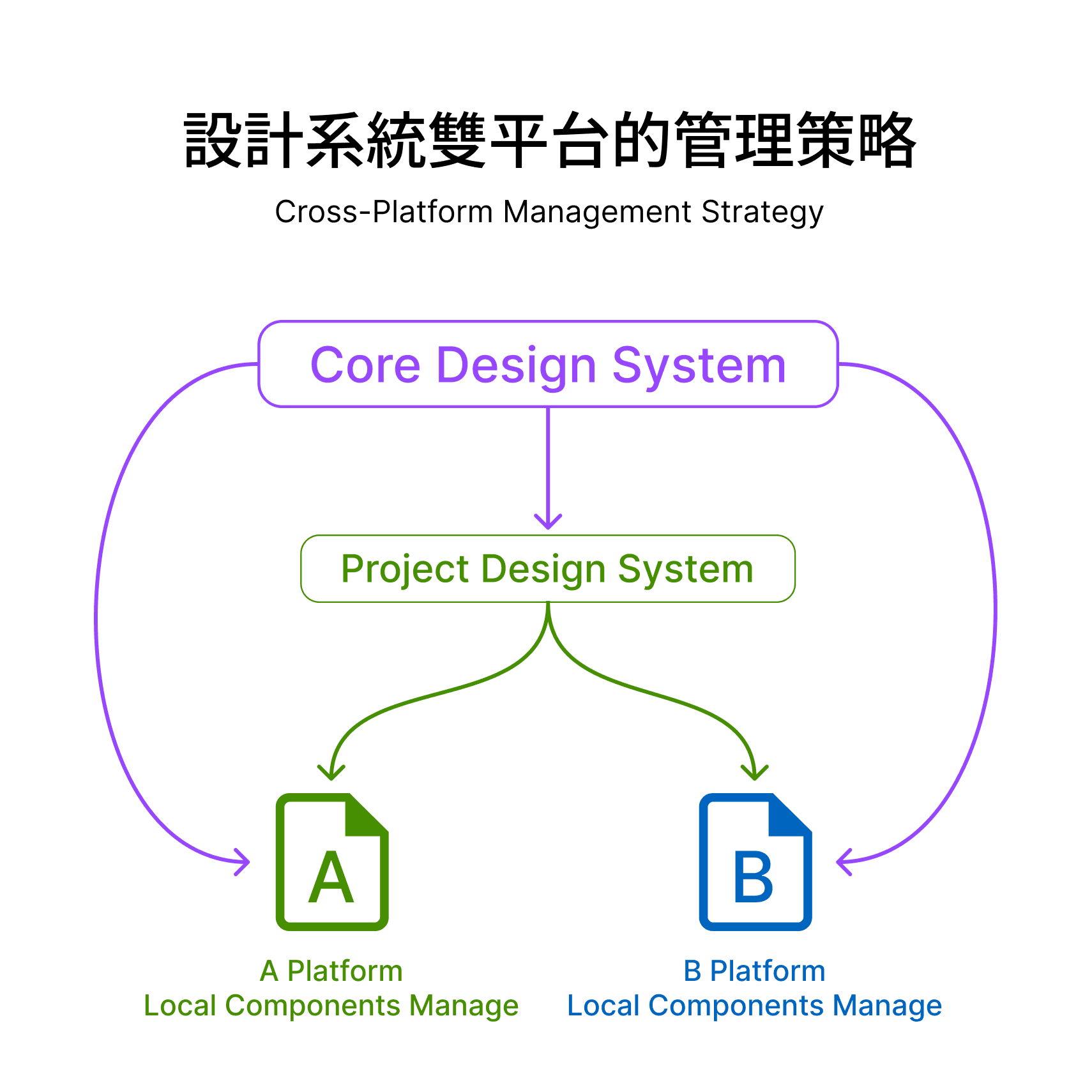 這樣我們只需要維護 Core 設計系統與專案設計系統 兩個主要系統,而平台特有元件則可以隨專案靈活調整,整體結構也更簡單,團隊三個人都能快速上手與維護。