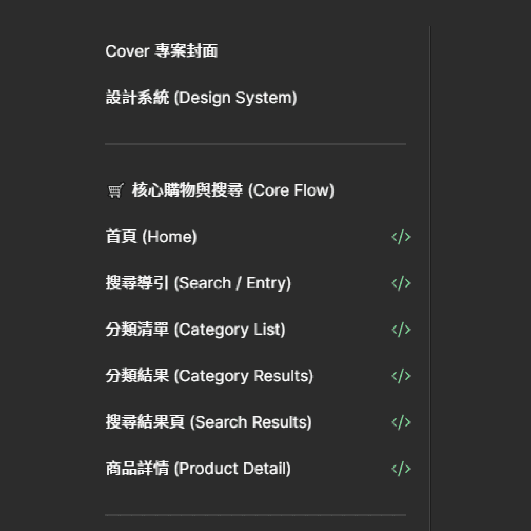 在 UI 執行上,我先負責建立主要頁面,例如首頁、搜尋結果頁與商品頁,並先訂定整體 Layout 與主要元件。同時我也把專案新增的元件整理到 設計系統 Page 做集中管理,讓同事可以快速瀏覽與使用,也方便日後整理進正式設計系統。