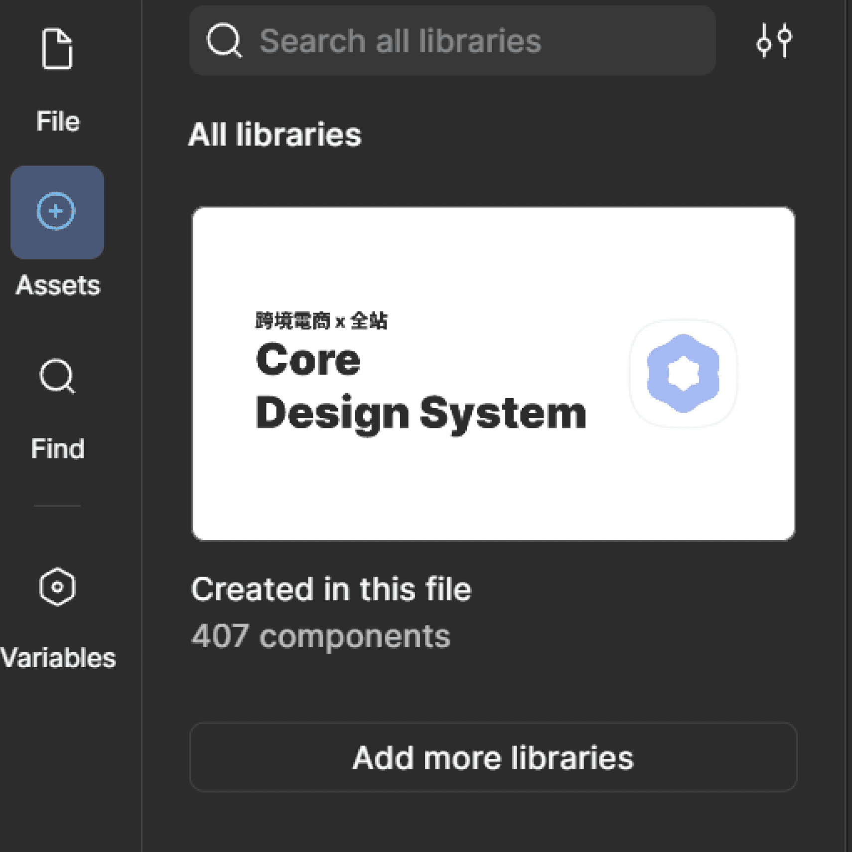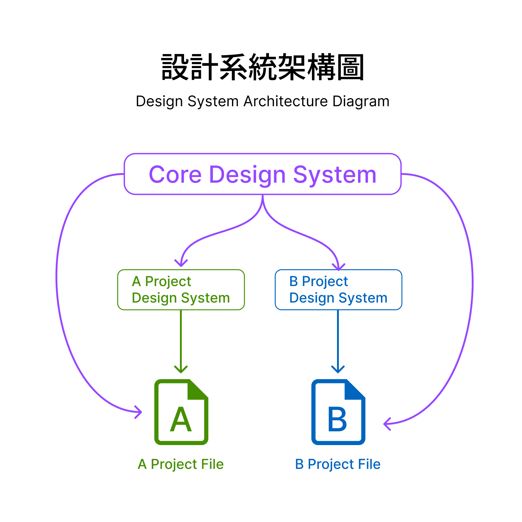 每個專案檔案會同時接入:Core Design System + Project Design System